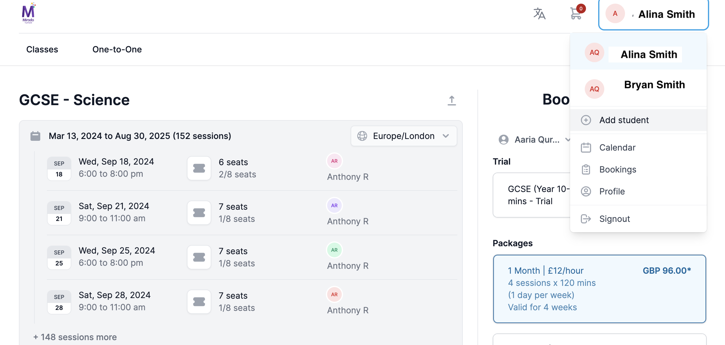 Repeat the steps from Step 2 when booking a lesson for another subject.