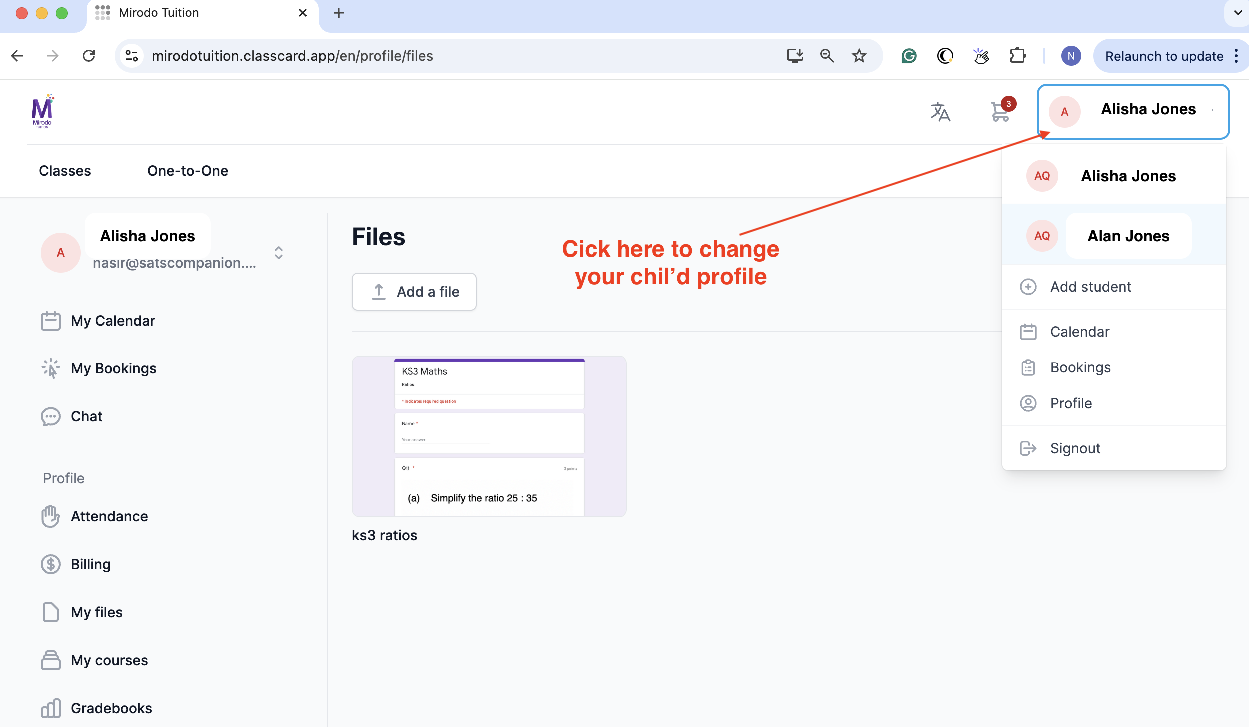 Please remember: If you have more than one child, select the correct account before accessing 'My Files'